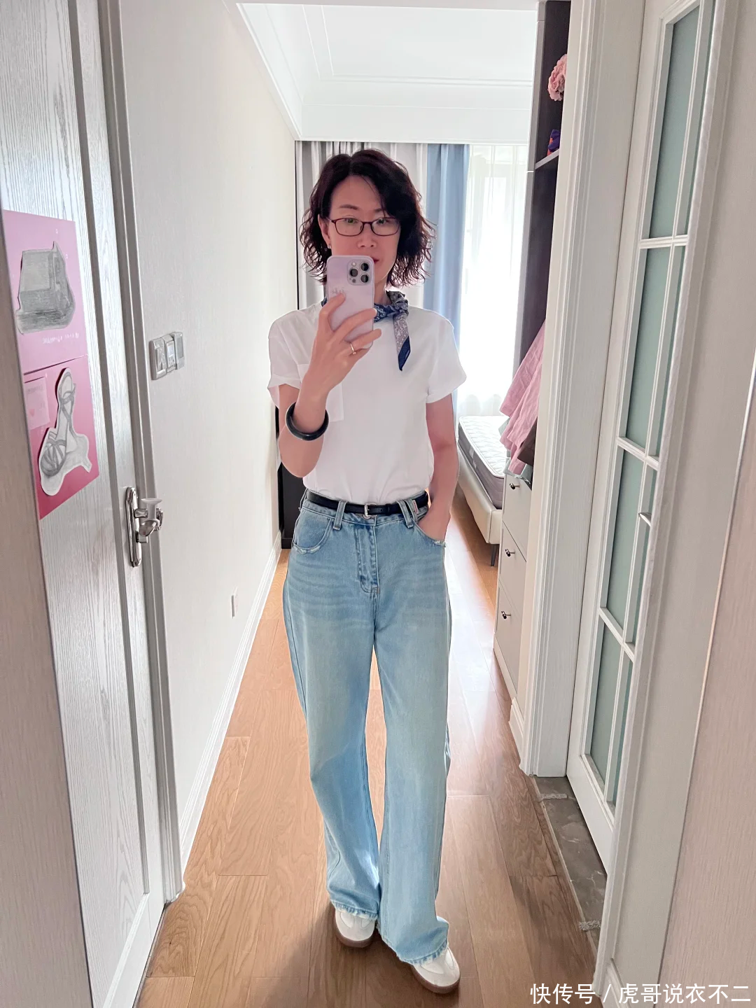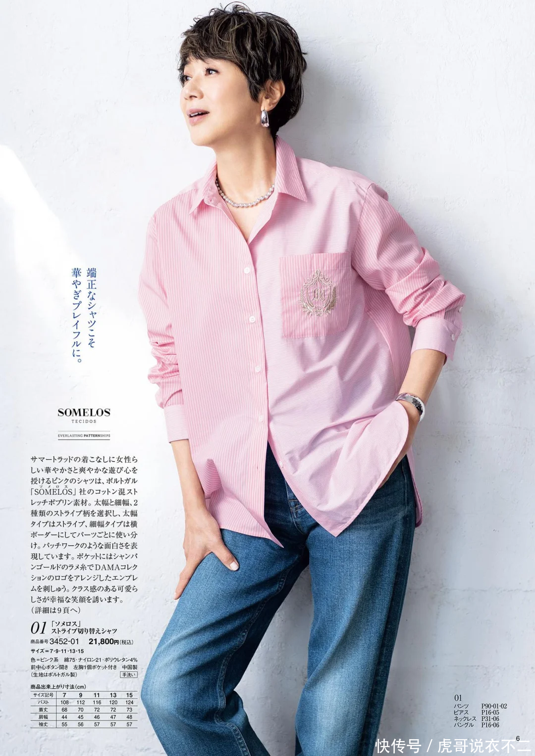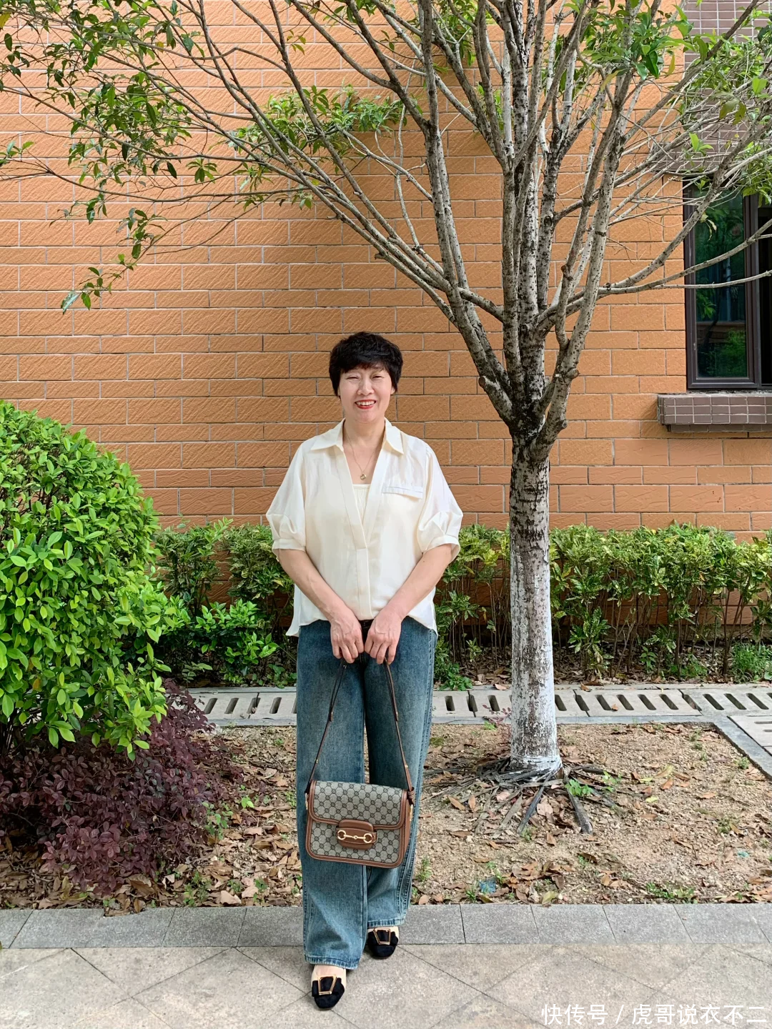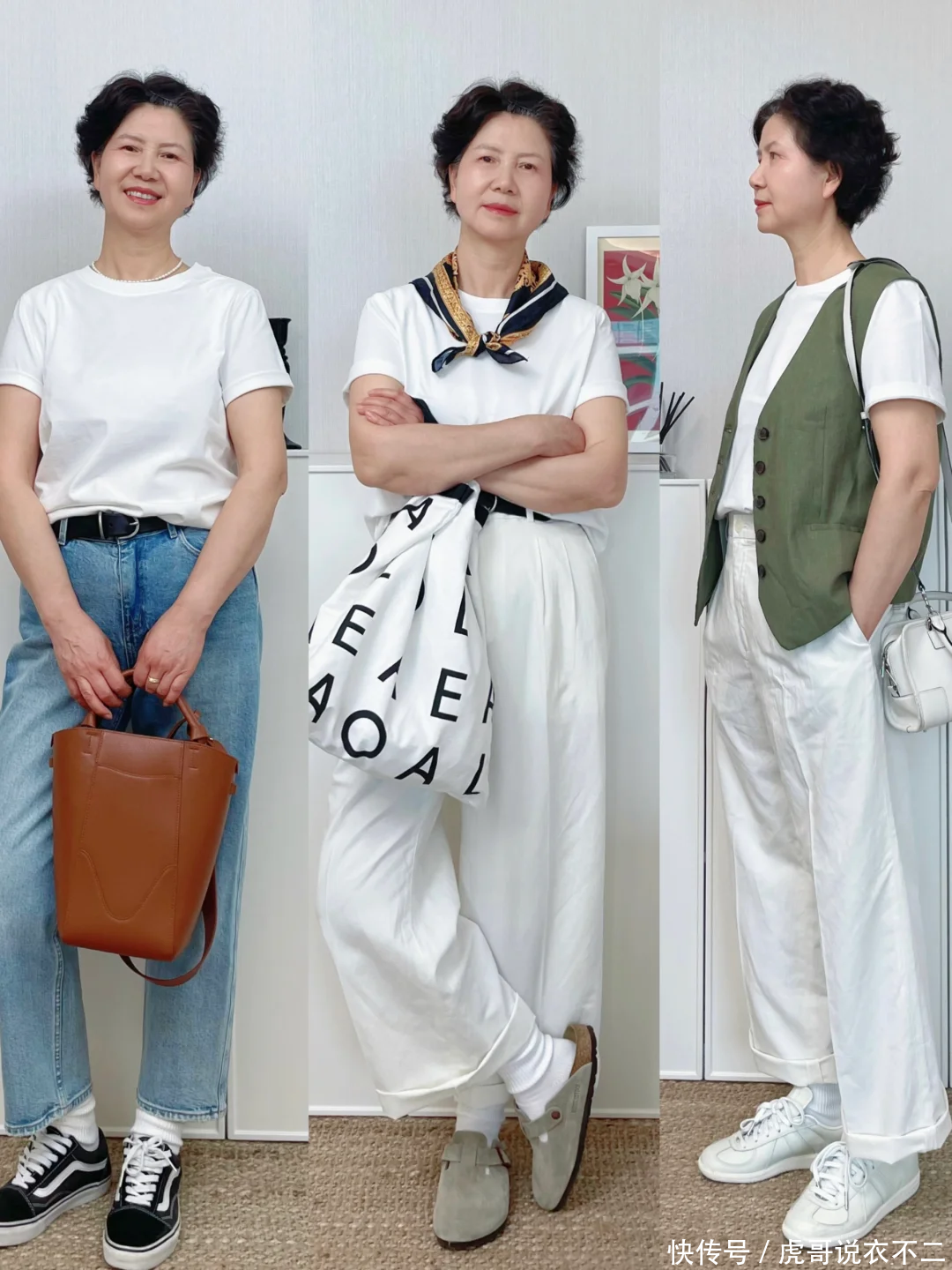 公式三:T恤/衬衫+牛仔裤、短袖针织衫+西裤50岁女人穿衣最忌刻板沉闷,否则容易给人老气横秋的感觉。为了避免这一点,衣橱里可以多备一些“无龄感”单品,牛仔裤就是其中之一。