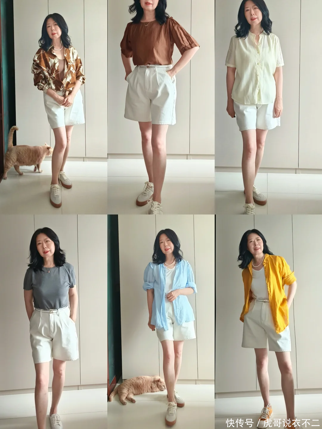 对于走优雅知性路线的50岁女人来说,西裤短裤是衣橱里必不可少的单品。以白色或者雾霾灰色为主的高腰西装裤,高级又利落。夏季用它搭配短袖针织T恤或者衬衫,针织材质能提升整体造型的温柔调性,让你看起来更加优雅大方。