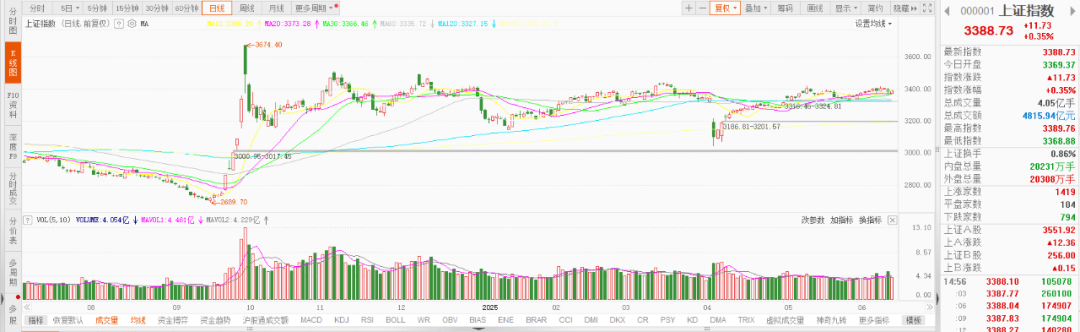 今日三大指数低开回升,创业板指领涨。整体全市个股涨多跌少,3500多只个股上涨。截至收盘,沪指涨幅0.35%,深成指涨幅0.41%,创业板指涨幅0.66%。两市成交金额1.22万亿,较上个交易日缩量2522亿。